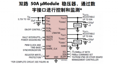 LTM4700:带数字电源系统管理功能的双路 50A 或单路 100A µModule 稳压器